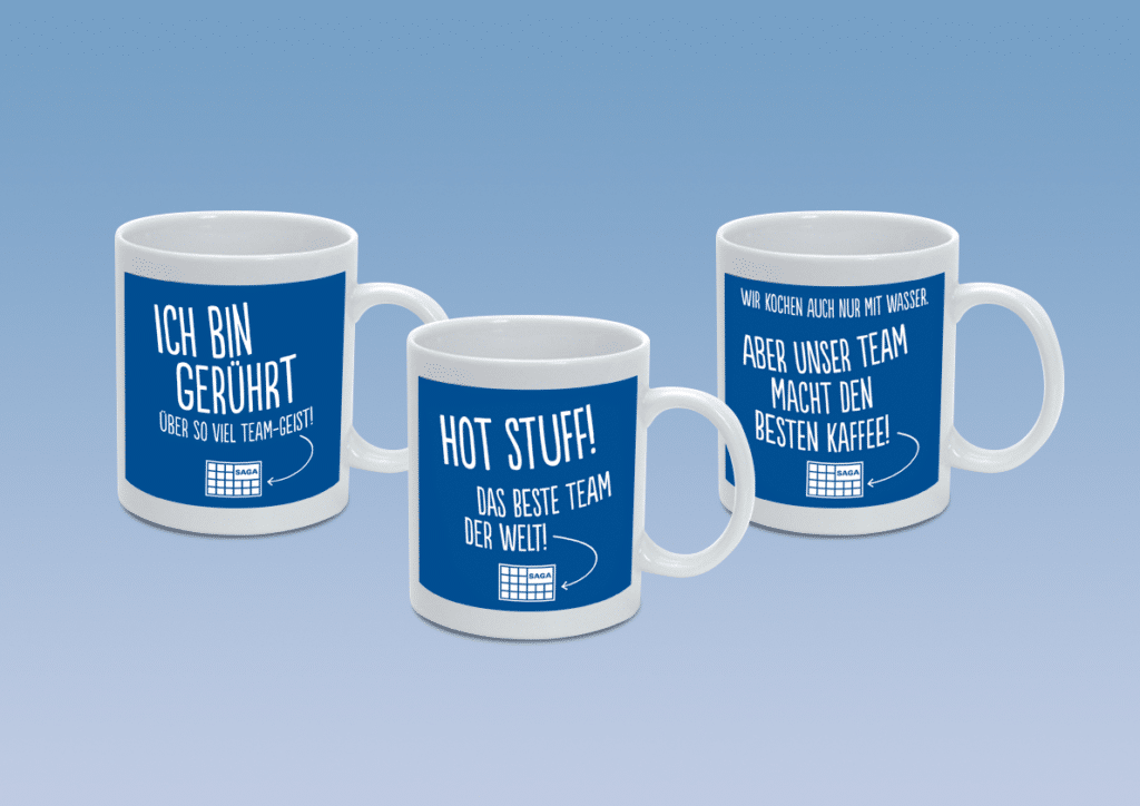 Mit unseren neuen Team-Tassen zeigen wir zusätzlich unser harmonisches Miteinander. Es macht gute Laune, mit den entsprechenden Mottos den besten Team-Kaffee zu trinken und gemeinsam am Erfolg zu arbeiten.